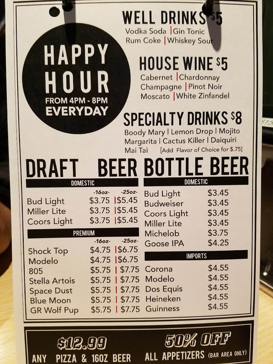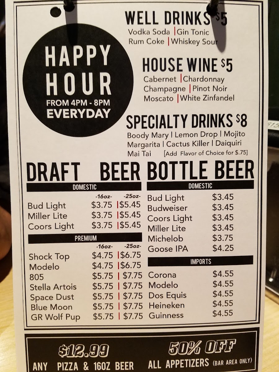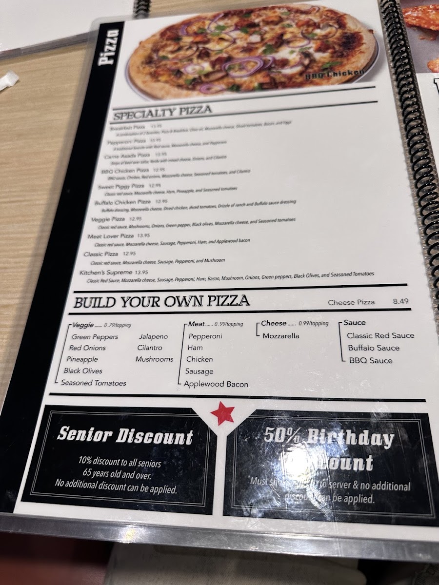 - Main Dishes and Sandwiches: Options include beef burgers, chicken breast club sandwiches, fish and chips, BBQ chicken pizza, Hawaiian pizza, and original hot buffalo wings.